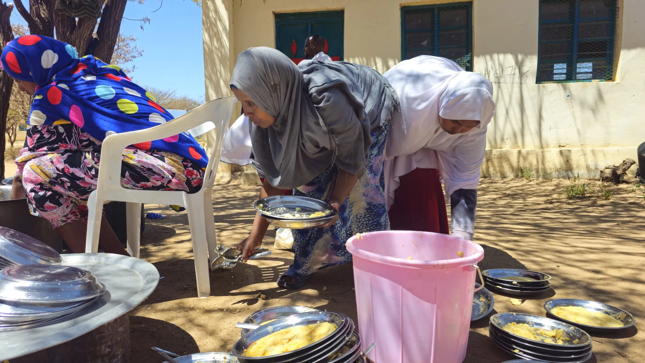 Muna and other parents wash dishes and prepare for tomorrow’s meals. Their work keeps the community moving forward, one bowl at a time.