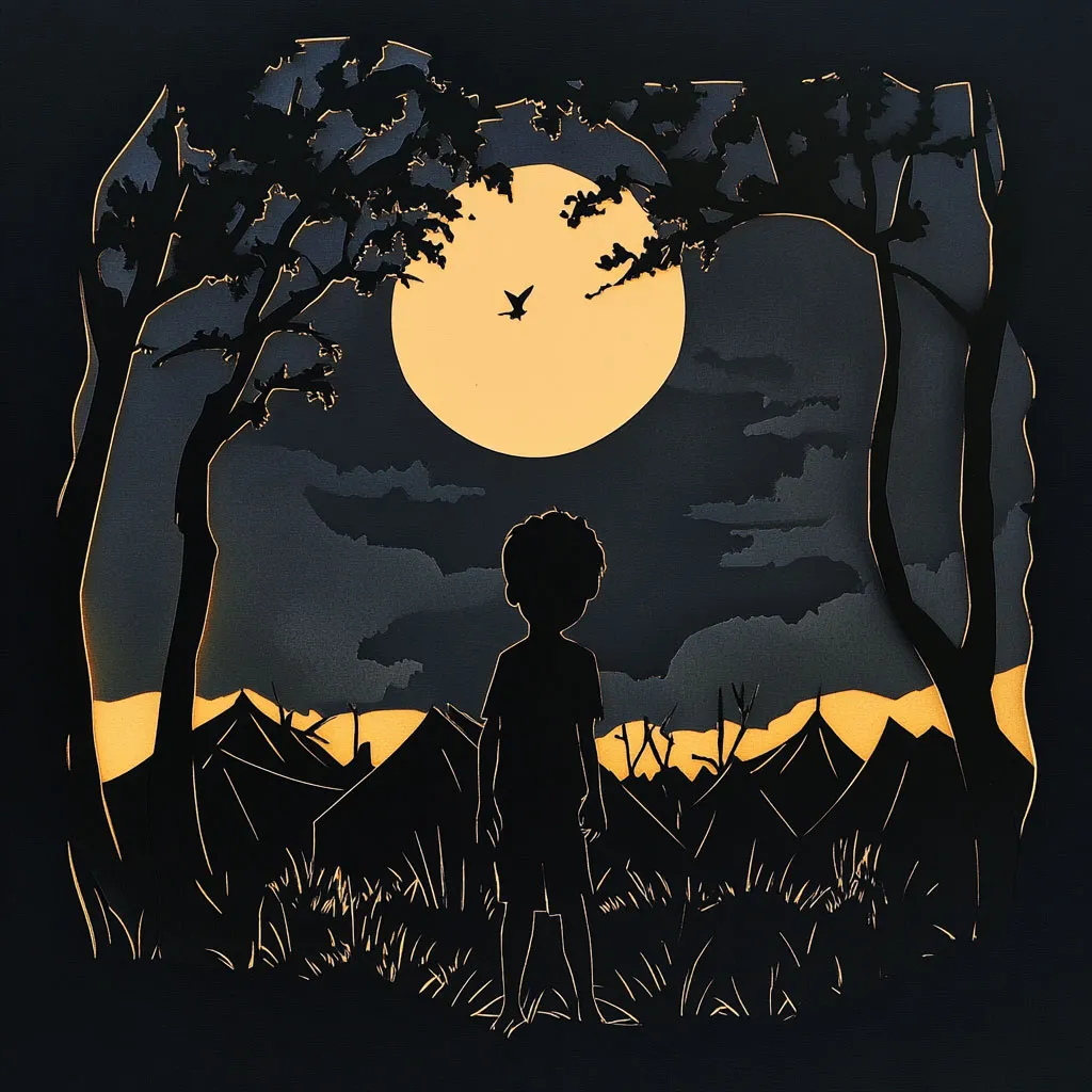 An illustration of a boy looking up at a tree.